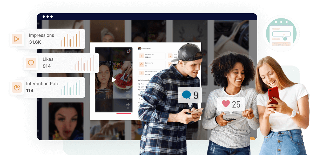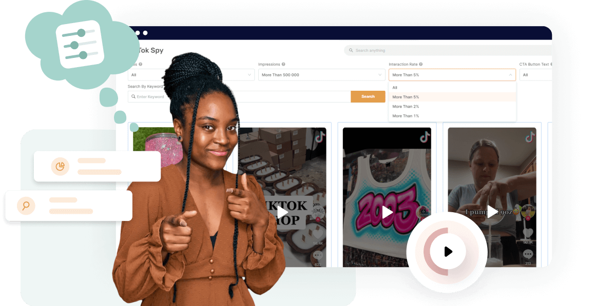 Our tool narrows down your search to the top-performing ads tailored to your niche, in seconds. You can filter by likes, impressions, interaction rate, CTA button text & keywords.
