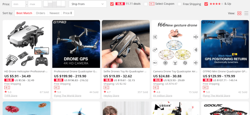 Now, if you go to any other category, for example, the drone category, you will see that AliExpress added the 11.11 filter on the filter section.