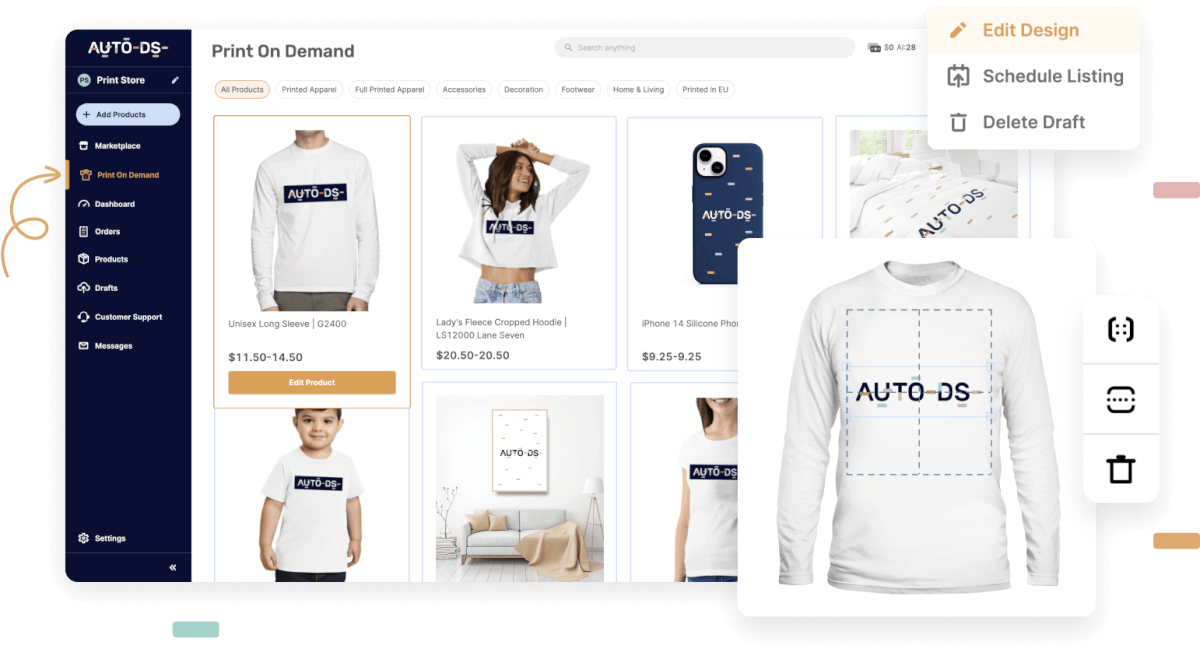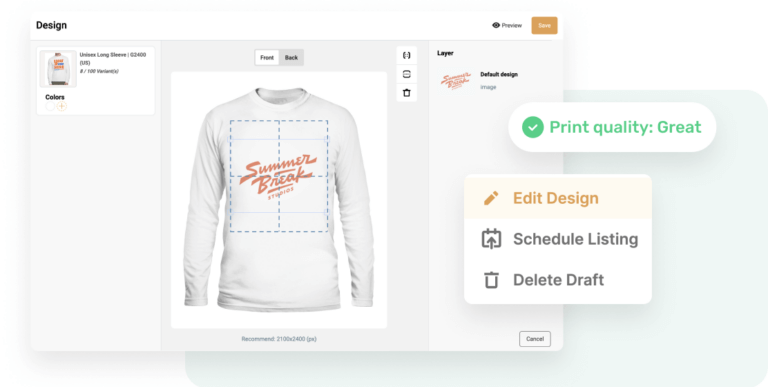 Design, customize, and ship products directly to your customers from one screen without switching between apps or sites.