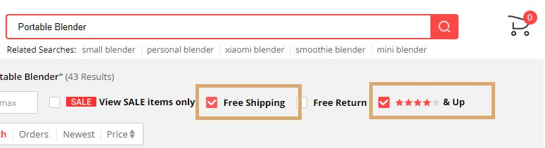 And let’s say that we want to search for a “Portable Blender”. From the filter menu, we will select the 4+ stars rating so we can only see the product that already got more than 4 stars rating. Also, we need to select the “Free Shipping” option to find just the product that offers free shipping on them.