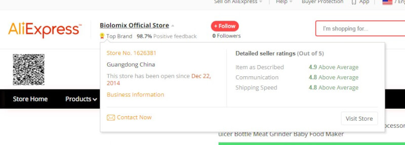 Now, make sure that the seller has been active for at least 1 year and has a high store rating (preferably 96% and up). We can do that by hovering over the seller’s store name on the top left: