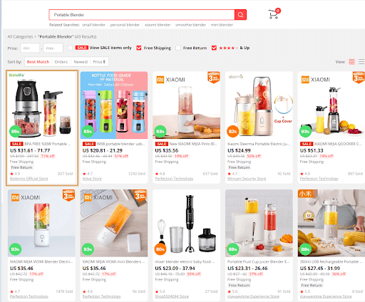 Now you have the best-matched items from your search laid out. Each item is from a different supplier, with its rating and number of items sold. Here are the results for “Portable Blender” for this example:
