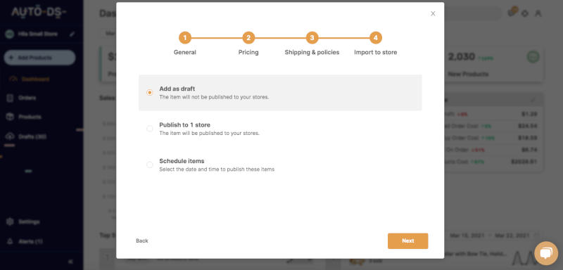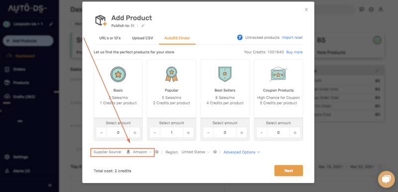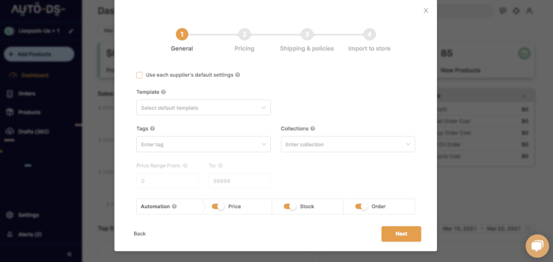 Choose the supplier you’d like to grab the hot selling items from. There are over 15 suppliers to choose from. Once you’re done with both steps, click “Next”.