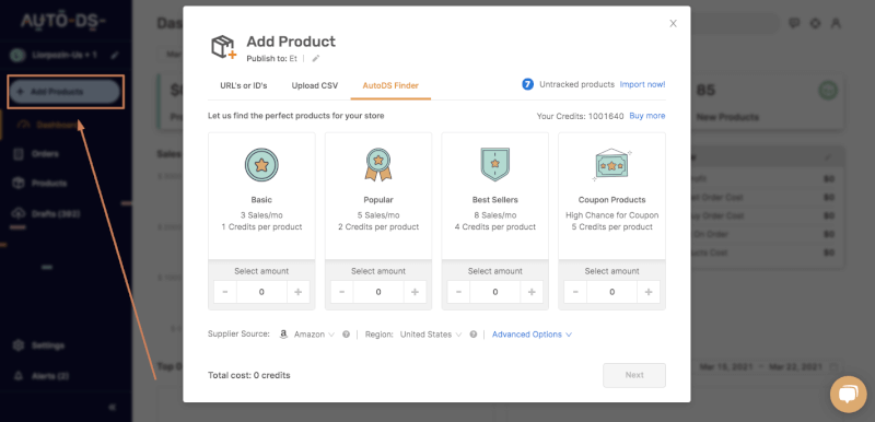 From the AutoDS side menu, click on “Add Products”, and then “AutoDS Finder”.