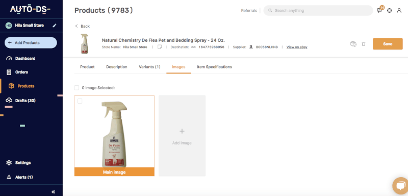 Next is your listing’s photos. As you can see, AutoDS grabbed the product’s pictures, highlighting the main one. Here, you can highlight a different picture to be the main picture for the listing, manually upload new pictures, create a collage of 3-4 pictures, and set your own watermark on your images.