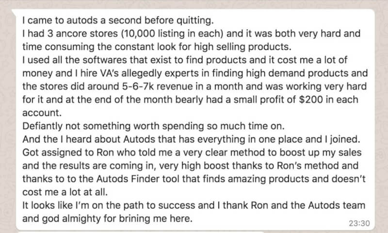 A few weeks passed and the “The big change” came – Ron joined AutoDS’ mentorship program with Clayton as his mentor. AutoDS’ mentorship program is a program that started 2 months ago and it allows AutoDS members with more than 2000 listings package to get a mentor for FREE. The mentorship includes private lessons with the mentor and participation in an active mentorship WhatsApp group where all the participants share the same target – SUCCESS.
