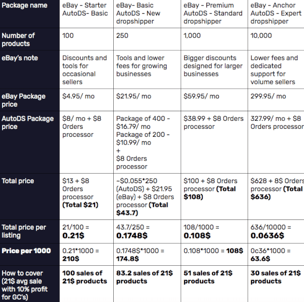 The math behind this rule also relates to the cost per listing on eBay and AutoDS, (as you can see in the table below) when you have higher amounts of products on eBay – the cost per listing decreases.
