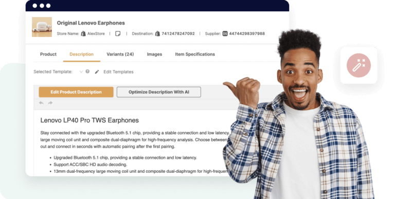 Create high-converting product descriptions instantly with AI-generated options. The tool generates optimized descriptions with relevant product info.