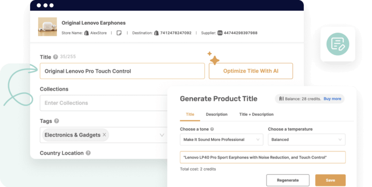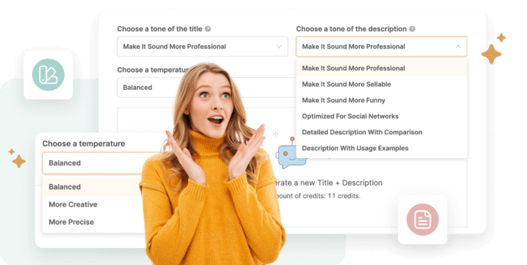 Adjust your product title’s and description’s tone and temperature. Set the tone to be funnier, more professional, sellable, etc. The temperature can be more creative, precise, or balanced.