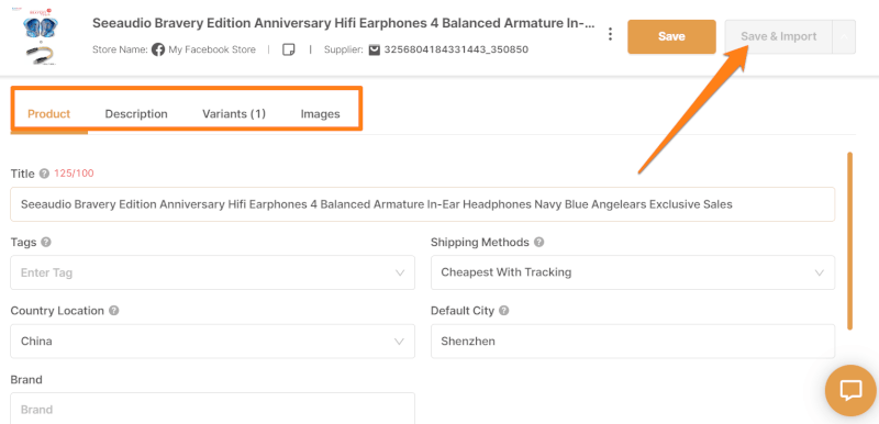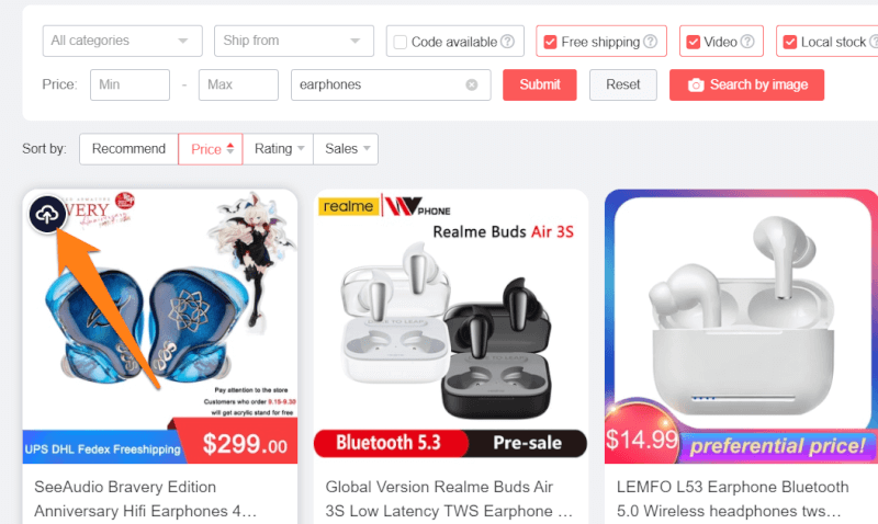Now, let’s import a pair of earphones in our store. By hovering over the product image, we can see a small cloud icon. Click on it, and the product starts uploading right away.