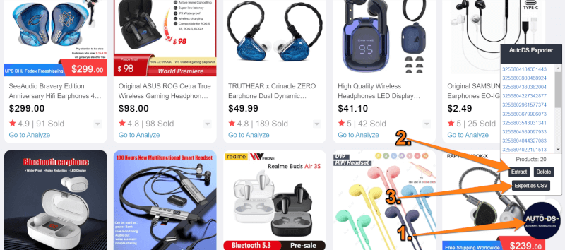 Since we’re covering the Dropshipping Center, let’s start there. On any results page, we’ll see a round AutoDS button in the corner. After clicking on it, we need to click ‘Extract.’ We just grabbed a bunch of products in one click!
