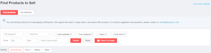 Once we’re on the Dropshipping Center Page, we can see how easy it is to use. On the top-left navigation bar we can find two options: ‘Find Products To Sell’ and ‘Products Analysis.’