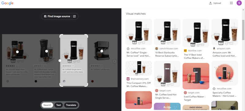Ultimately, the most relevant is the ‘search’ option when conducting product research for our dropshipping store. From here, we can see visual matches and discover various suppliers of the product. In this example, we can see that the coffee maker is available on different supplier websites such as Lowe’s, Amazon, and many more!