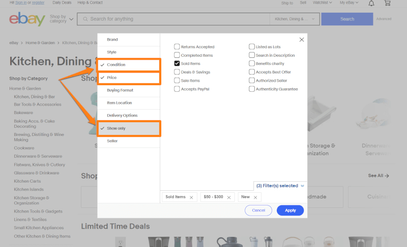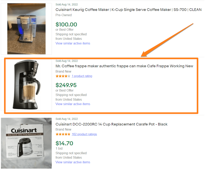 Similarly, we can add filters such as price and sold status to find products that eBay users are buying. Then, we can continue adding filters to narrow our search according to our specifications. For demonstration, let’s search for a “coffee maker” on eBay, as the kitchen and appliances category is an evergreen niche.