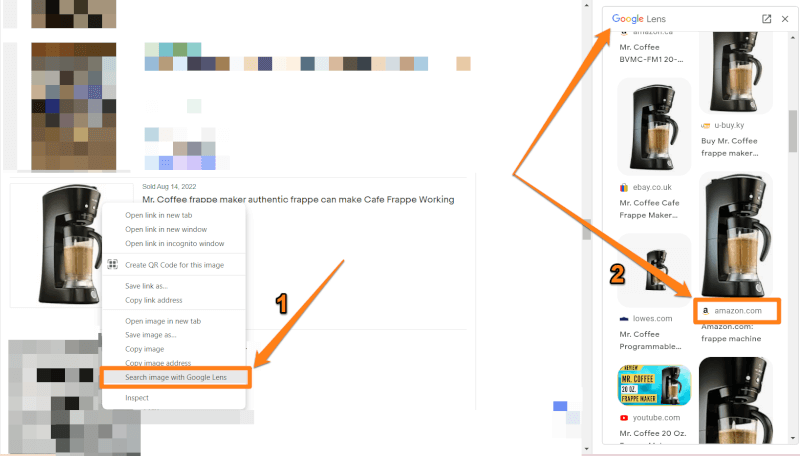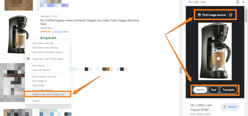 Once we find a suitable product, we can instantly search the image with Google Lens. We can do so by right-clicking on the product image and selecting Search image with Google Lens. After we click on it, a Google Lens window will appear on the right side of the browser, which offers the following options: