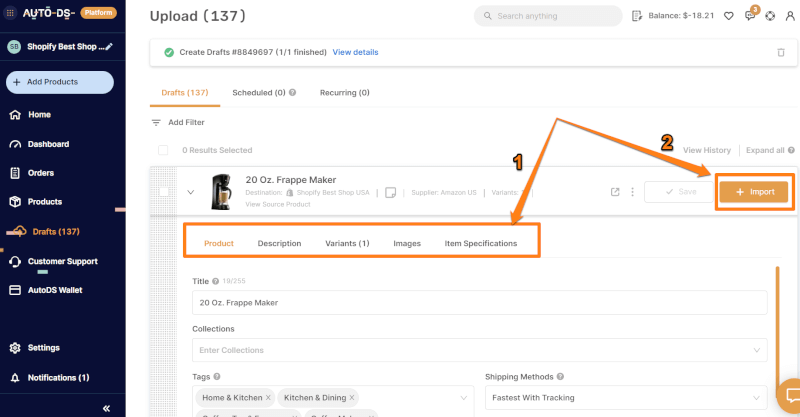 After we optimize our product, click on Import. Then, the AutoDS tool uploads the product to AutoDS integrated selling channels. To clarify, selling channels are platforms where our customers buy our products, such as eBay, FBMP, Shopify, and Wix.