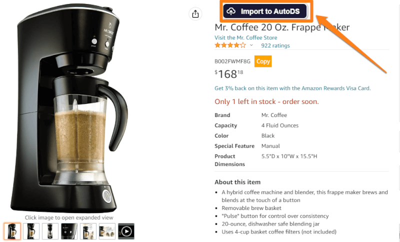 For illustration, let’s look at the one-click import feature. So, let’s go back to our product (coffee maker machine) that we found on Amazon. Before we start the importing process, we need to download the AutoDS Dropshipping Helper Extension.