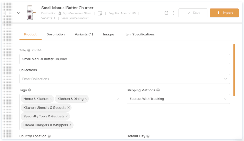 Remember that search engine optimized (SEO) products become more relevant in customer web searches and are more visible on the market to our customers. Lastly, we just need to click the ‘Import’ button to publish the item to our dropshipping store.