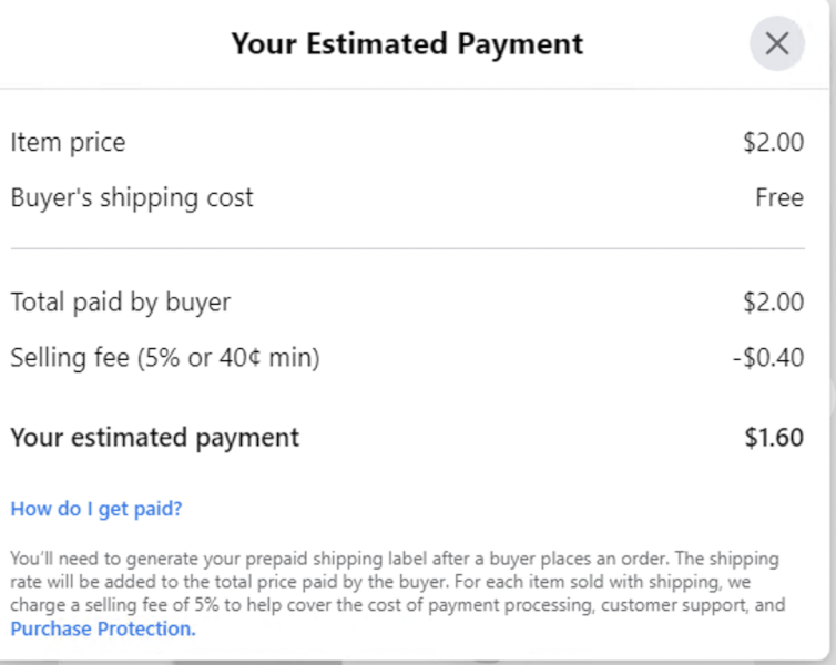 Facebook charges a %5 fee or a minimum of $0.40 on every sale we make, whichever is higher. For instance, if we sell a product for $2.00, Facebook deducts a $0.40 fee.