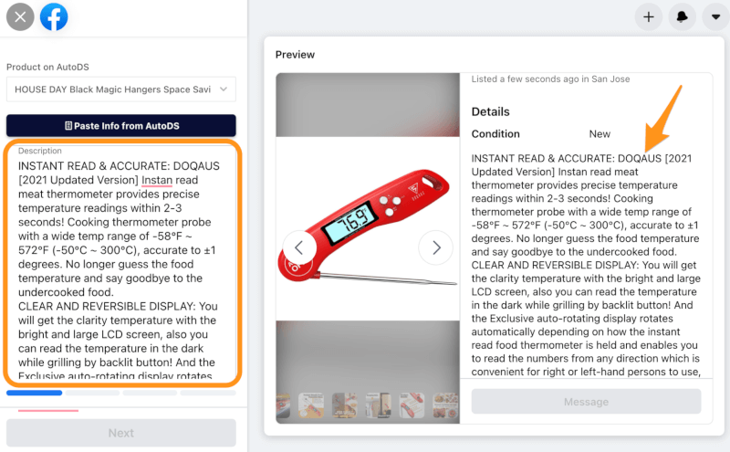 Thanks to the automation features of AutoDS, changes to the price and stock are automatically reflected in the product bar and on Facebook Marketplace.