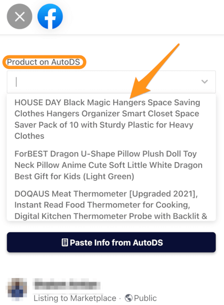 After each synchronization, all products imported to AutoDS but not uploaded to Facebook will appear above the ‘Paste info from AutoDS’ button in a drop-down menu.