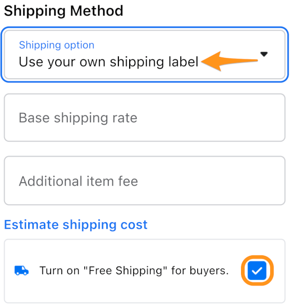For the shipping option choose, ‘Use your own shipping label.’ Leave the ‘Base shipping rate’ and ‘Additional item fee’ blank and select to turn on free shipping for buyers.