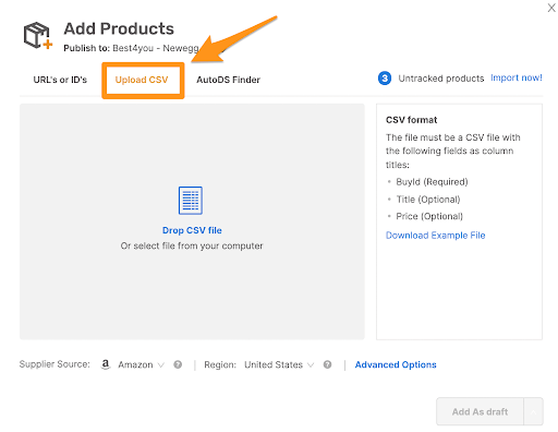 Here is where the AutoDS Importer will pop up with a few importing options. To upload your CSV file and import all your new products, select the second tab from the left ‘Upload CSV’.