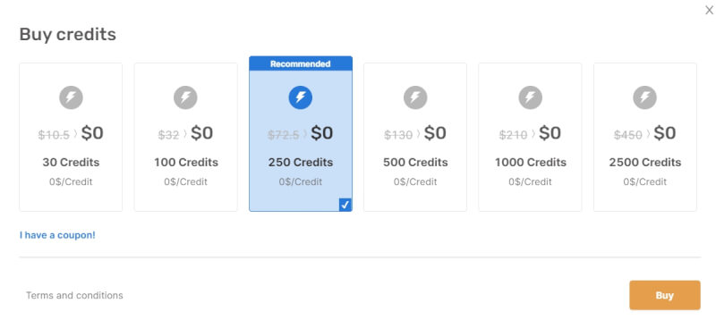Then, we can choose which credits package suits us best. Click on the credits package you want, then click ‘Buy’ on the bottom right, and you’re good to go!