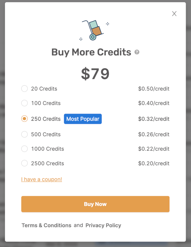Then, we can choose which credits package suits us best. Click on the credits package you want, then click ‘Buy Now’ on the bottom, and we’re good to go!