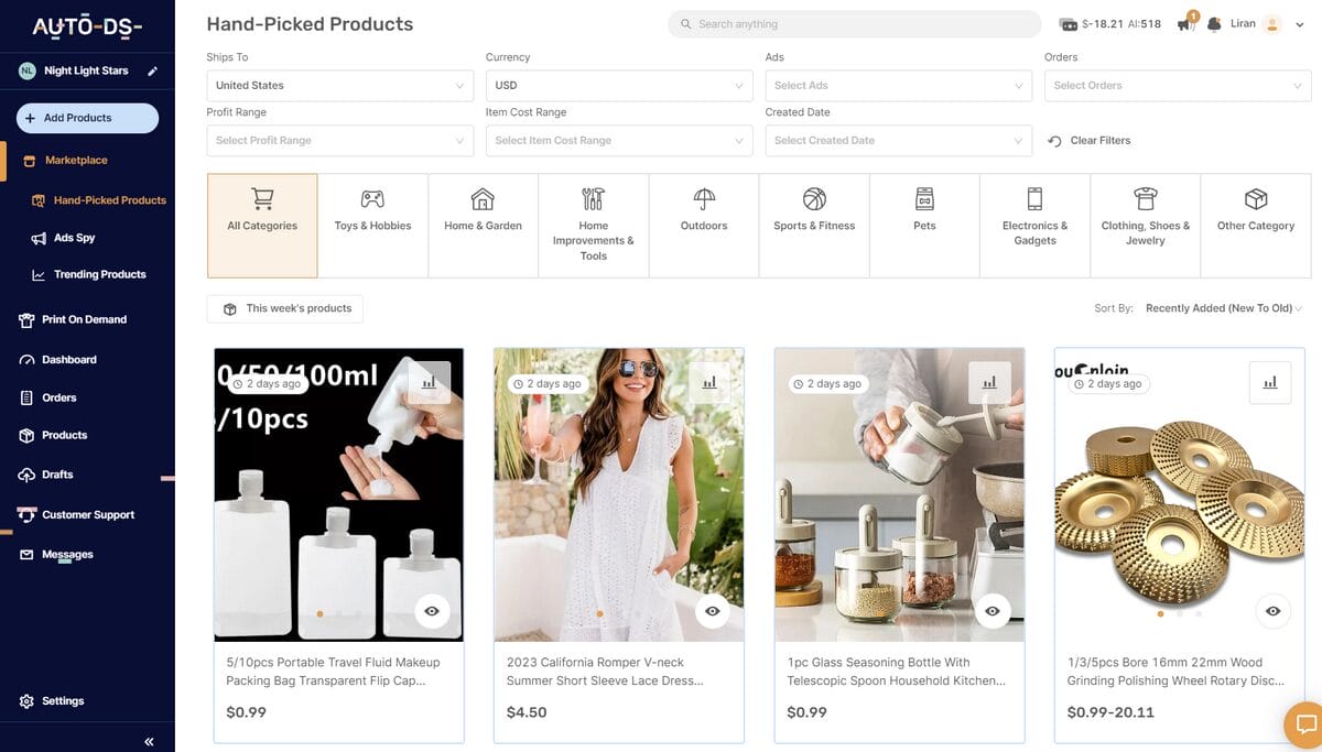 The AutoDS Hand-Picked Products Hub feature is designed to help dropshippers identify high-potential products. With it, you gain access to a collection of proven best-selling products. In this way, you can save time and effort that you can use in prior aspects of your business. With the AutoDS Hand-Picked Product feature, you can fill your product catalog with a huge variety of items, which enhances your ability to reach larger audiences, find hot sellers in seconds, maximize your sales, and scale your dropshipping store more quickly. These are some of the main features: