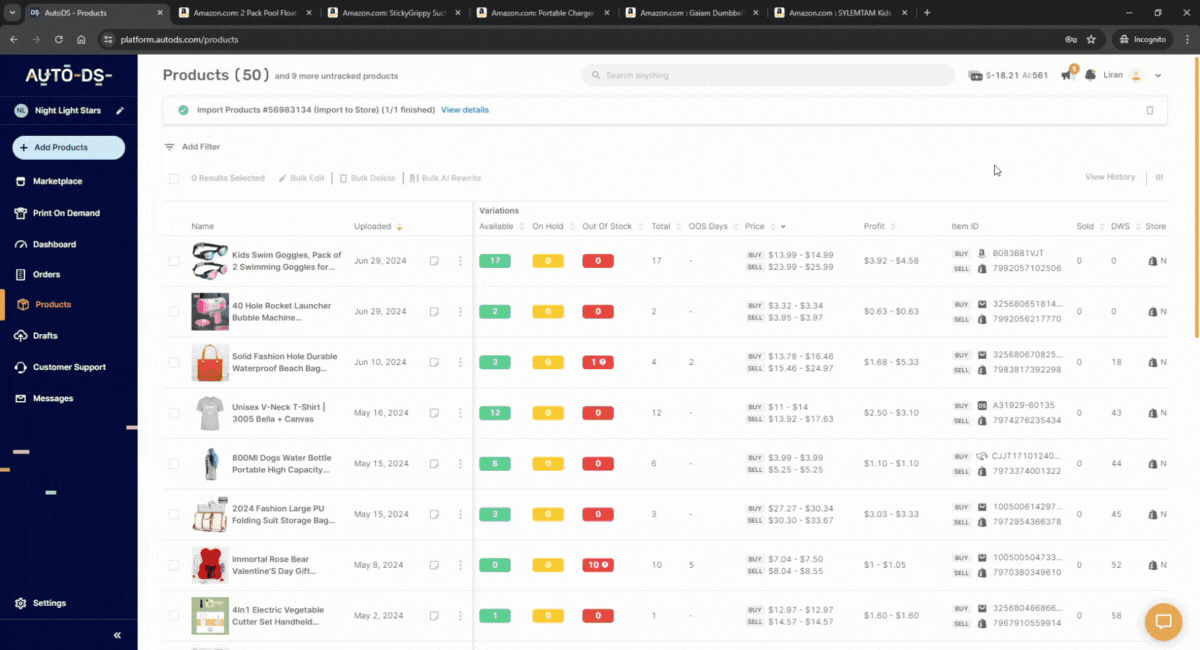 - Instant Product Imports: With AutoDS, you can quickly import products from Amazon to eBay using features like the One-Click Importer or Bulk Importer.