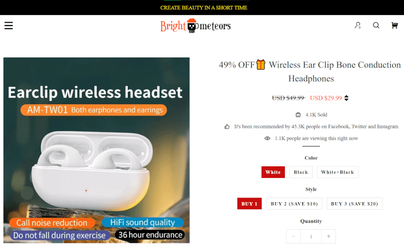 Next, we’ll analyze Bright Meteor’s website, which sells wireless earl clip headphones at $29.99, including shipping. Notably, the seller advertises the substantial sales volume of the product and the number of viewers who are checking out the item. Doing so can attract more customers to purchase the device since many others have already tried it.