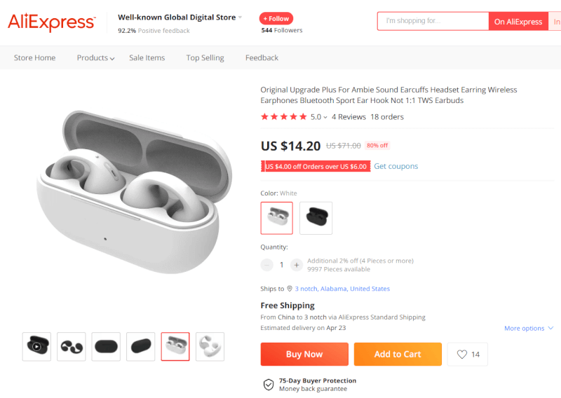 On the supplier’s website, AliExpress offers the same product at $7.79, including shipping. Interestingly, we can dropship the item along with many promotions, such as vouchers and discounted prices. The supplier also extends a 75-day buyer protection program and free returns.