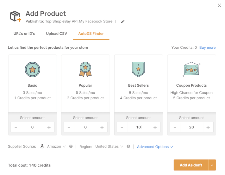 You can select the Finder category you want to import products from, based on the number of sales they had during the past month, or from the Coupons Finder category.