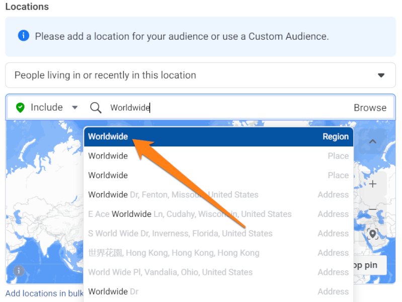 Let’s get the ball rolling with the first audience settings adjustment, the location. As such, we begin by removing all default settings under ‘Location’ and setting it to worldwide.