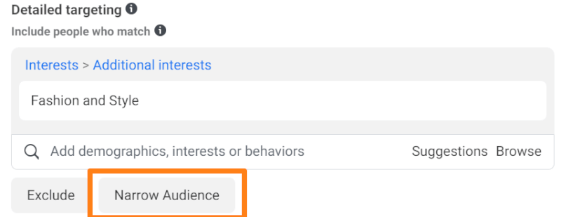 Now, if the potential reach gets too high when we input our detailed targeting preferences, we can use the ‘Narrow Audience’ option. What this section does is allows for further filtering by adding additional limits to the targeting.