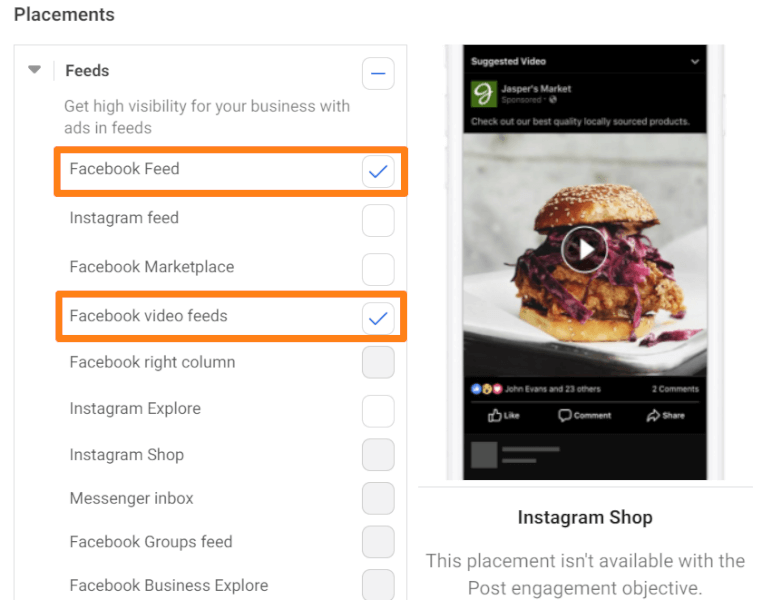 Next, we have the option to choose where on Facebook we want our ad to appear. For best results, uncheck everything except for ‘Facebook News Feed’ and ‘Facebook Video feed’. In fact, we are leaving the ‘Facebook Video Feed’ checked because people like scrolling through videos which increases the chances of our ad reaching them.