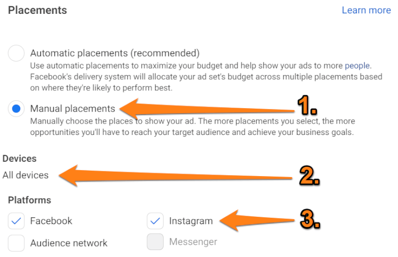 Then, for ‘Devices’ we need to leave it on ‘All Devices’ allowing the ad to appear on both mobile and desktop. And, for ‘Platforms’ we will uncheck all except for ‘Facebook’ and ‘Instagram’.