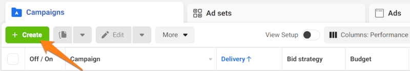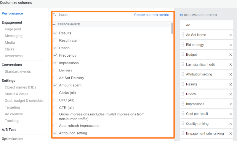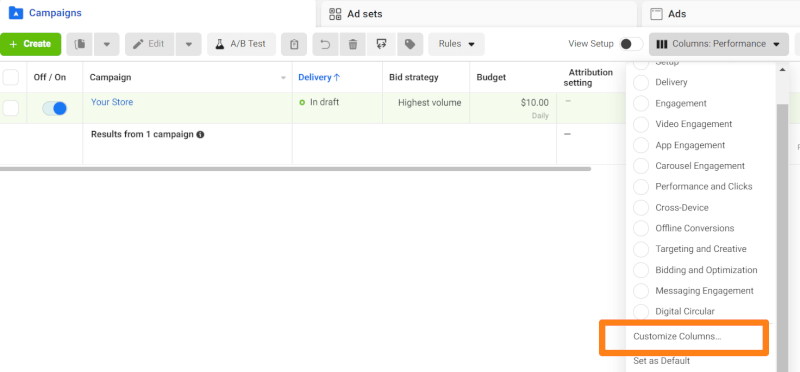 First, we need to click on any of the three primary tabs (‘Campaign,’ ‘Ads sets’ or ‘Ads’), and slide over to the right where the different results data columns should appear. Next, we will customize the columns by clicking on ‘Columns: Performance’ and selecting ‘Customize Columns’ from the dropdown menu. At this stage, we need to select the metrics we want to analyze.