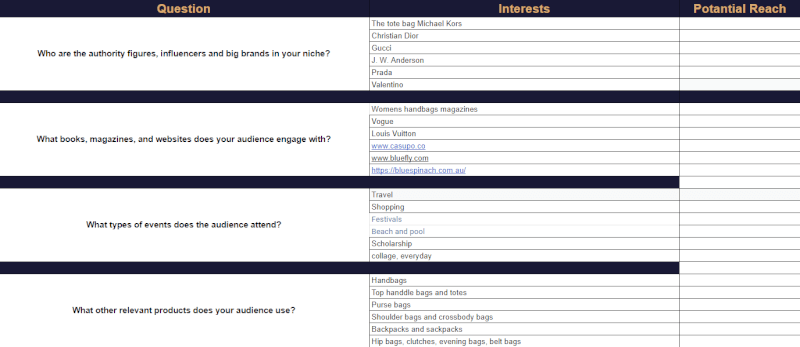 In particular, the Audience Research Spreadsheet is organized around the 4 key questions for successful audience research. These questions are how we will conduct our audience research. In fact, this set of questions is curated in order to know our target audience’s interests. With that in mind, their interests are based on three aspects. Accordingly, these three aspects include their event attendance, the content they engage with, and the relevant products they use. So, let’s take a look at the four key questions:
