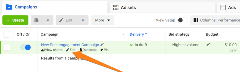 So, without further ado, we’ll begin by logging into Facebook Ads Manager, clicking on ‘All Tools’, and going to the ‘Ads Manager’. Here we can see existing campaigns and ad sets. What we will do next is click on the ‘Edit’ button to open the campaign we have been working on and locate the Ad Tab. In the Ad Tab, we can begin our configuration process.