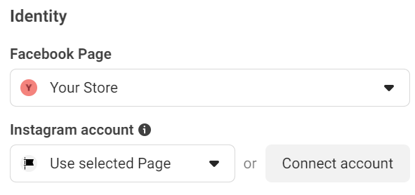 Following the ad name, there is an ‘Identity’ section where we can choose which Facebook Page to use for the ad. Every Facebook ad is essentially a post that we instruct Facebook to promote. Therefore, the ad must have a specific location; otherwise, the ad cannot launch.
