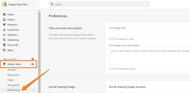 In this example, we’ll take a look at how to install the Facebook Pixel on our Shopify store. To begin, we need to navigate to our store’s dashboard, then click on ‘Online Store’ and select ‘Preferences’.