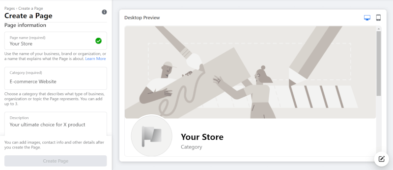 Notably, a pro-tip is to set our category to E-commerce Website since we will direct visitors from this page to our dropshipping store. Next, we’ll click on ‘Create Page’ and wait for a few seconds for Facebook to create our page.