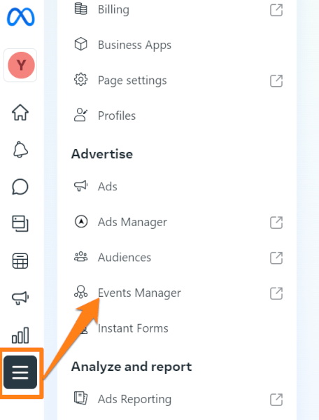 Once the new tab opens with the Events Manager page we need to make sure to select the right ad account. We can select the correct ad account from the drop-down menu in the top right corner.