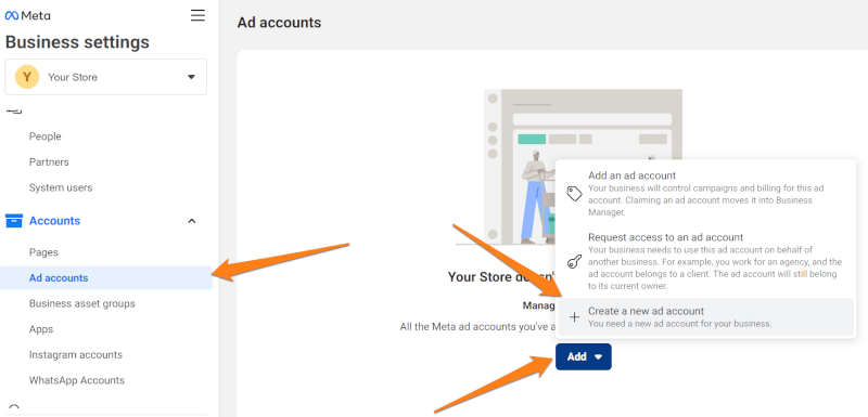 Finally, in the next set of steps, we can create our Ad accounts. On the right side, we can see the ‘Ad accounts’ button. Then we can click on the ‘Add’ button which will release a drop-down menu. Now, from this menu, we can choose the ‘Create a new ad account’ option.