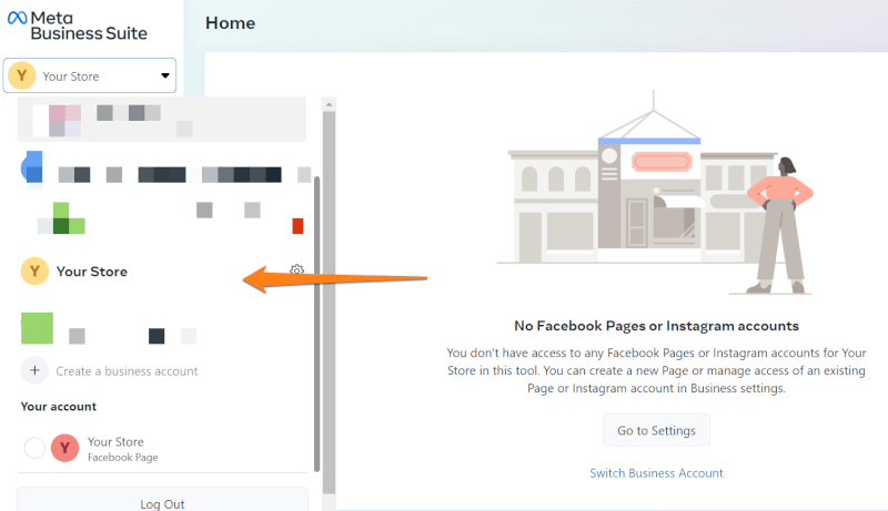 Finally, since we have our Business account, we can go ahead and create our Ads account now. First, we start off by going to the drop-down menu on the left-hand side and selecting our previously created Facebook page. We’ll make sure to choose the Facebook page of the dropshipping store we want to promote.