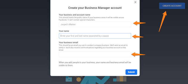 Next, we’ll click on the ‘Create Account’ button and fill in our business information. A pop-up window will appear where we can fill in our own name, our business name, and business email.