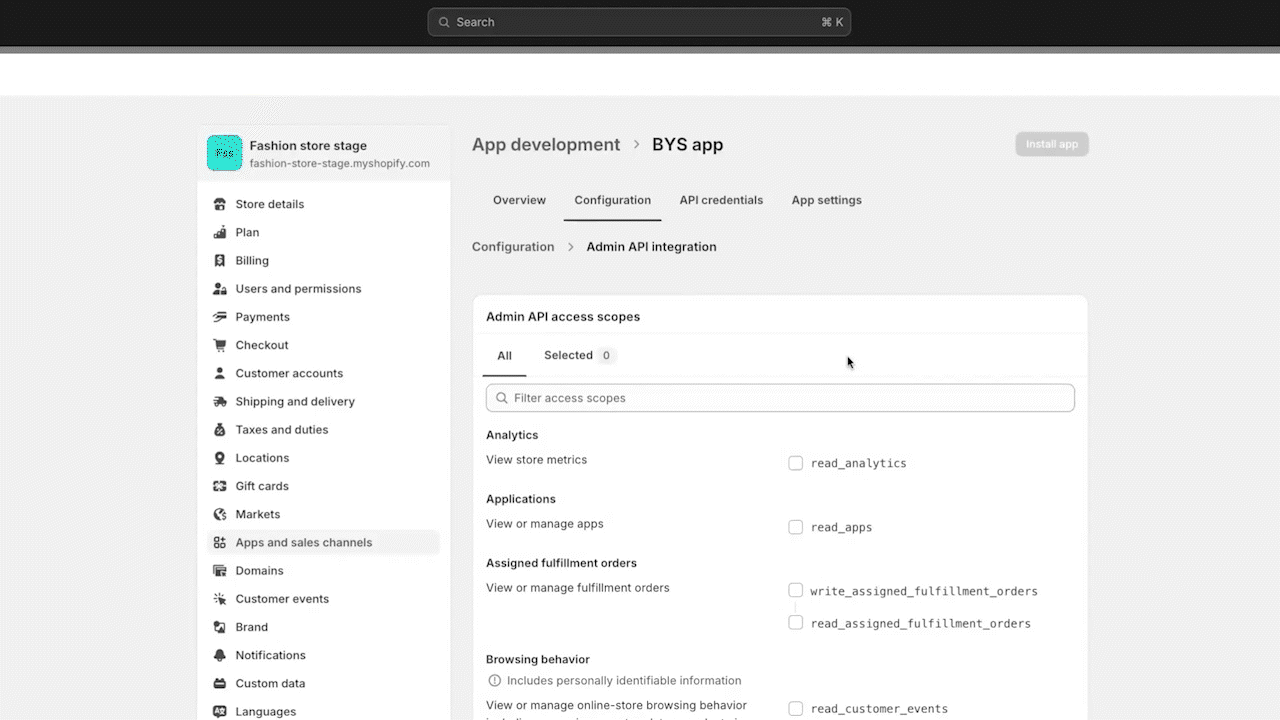 5. Supercharge Your App’s Abilities. Scroll down a bit until you see a section called “Admin API.” Special permissions are needed to access different parts of your store. Click on the option that gives it “Read and write” permissions. This basically allows BYS to see and change things in your store to make it better.