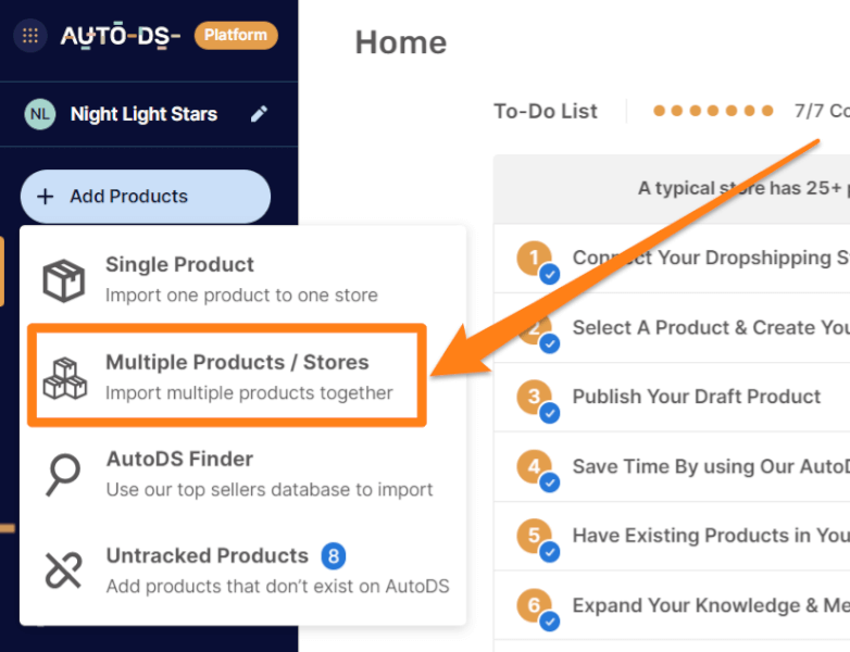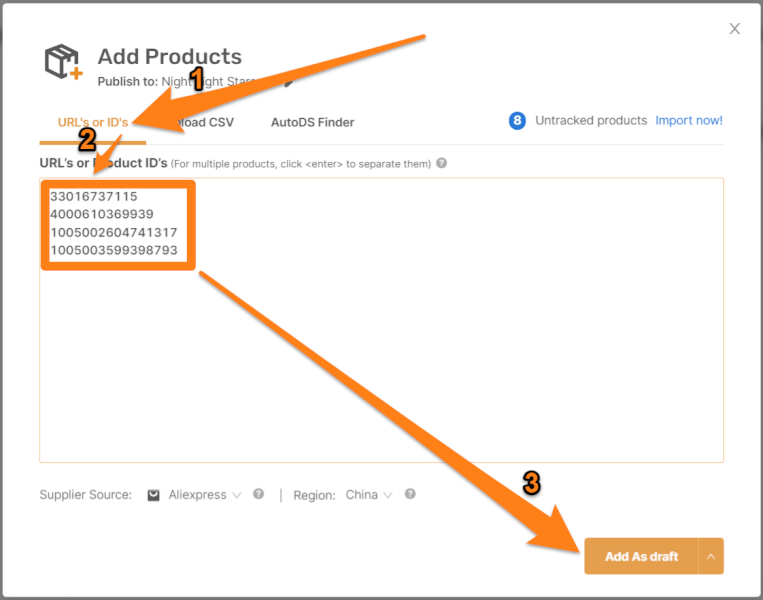 After doing so, enter the AutoDS platform and click ‘Add Products’ on the left sidebar. Then, choose the ‘Multiple Products / Stores’ option. On the dialog box that appears, paste the product URLs/IDs. Then, click ‘Save As Draft’ to confirm.
